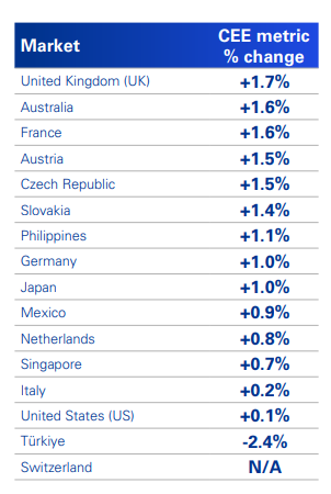 The first highlight of the report is a rise in most European nations’ CEE metrics, with the UK leading the way (up 1.7%) and strong growth in Asia. Only the US, Italy and Turkiye (down 2.4%) seem to be struggling in boosting their scores.