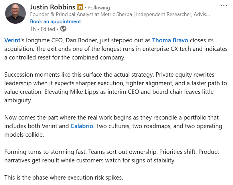 Justin Robbins, Founder and Principal Analyst at Metric Sherpa, said the takeover marks a leadership reset aimed at faster execution, but warned that integrating Verint and Calabrio will bring short-term disruption and elevated risk.
