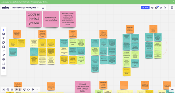 At Hellon, we usually use a mix of tools depending on the objective of the exercise. Often, we use a video conferencing platform such as Skype or Teams for communication, and, another platform on which to collaborate or ask for feedback. Miro and Mural are great platforms for post-it-type workshopping, in which all participants can work on one canvas or template simultaneously, which works very well for journey mapping, ideation and analysis.
